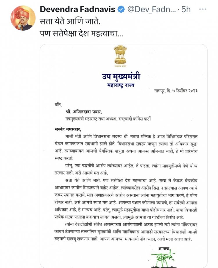 फडणवीस ने मराठी में अपने पत्र में लिखा, "पूर्व मंत्री एवं विधानसभा सदस्य नवाब मलिक आज विधानमंडल में आए और कार्यवाही में भाग लिया। विधानसभा सदस्य के रूप में उन्हें यह अधिकार प्राप्त है। मैं शुरू में ही स्पष्ट कर दूं कि हमारी उनसे कोई व्यक्तिगत दुश्मनी या द्वेष नहीं है। लेकिन, जिस तरह से उन पर आरोप लगे हैं, उसे देखते हुए हमारा मानना है कि उन्हें महागठबंधन में लेना उचित नहीं होगा। सत्ता आती है और जाती है, लेकिन सत्ता से ज्यादा महत्वपूर्ण देश है। फिलहाल वह सिर्फ मेडिकल आधार पर जमानत पर बाहर हैं। अगर उन पर लगे आरोप साबित नहीं हुए तो हमें उनका स्वागत करना चाहिए। लेकिन हमारी स्पष्ट राय है कि ऐसे आरोप लगने पर उन्हें महागठबंधन का हिस्सा बनाना ठीक नहीं होगा। बेशक, यह चुनना पूरी तरह हमारा अधिकार है कि किसे हमारी पार्टी में शामिल करना है। हालांकि, हर घटक दल को यह सोचना होगा कि वह महागठबंधन में बाधा नहीं बनेगी, इसलिए हम इसके खिलाफ हैं। हम तत्कालीन मुख्यमंत्री और महा विकास अघाड़ी सरकार के विचारों से सहमत नहीं हो सकते, जिसने उन्हें देशद्रोहियों के साथ संबंध रखने के आरोप में गिरफ्तार किए जाने पर भी मंत्री बनाए रखा। मुझे आशा है कि आप हमारी भावनाओं पर ध्यान देंगे।"