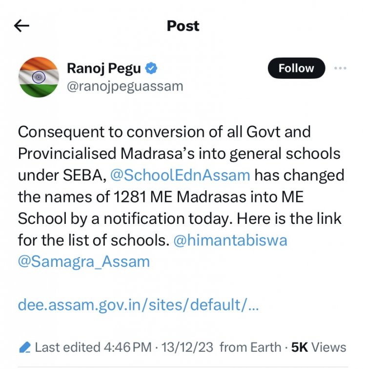 असम के शिक्षा मंत्री रनोज पेगू ने एक्स प्लेटफ़ॉर्म पर ट्विट से दी जानकारी।